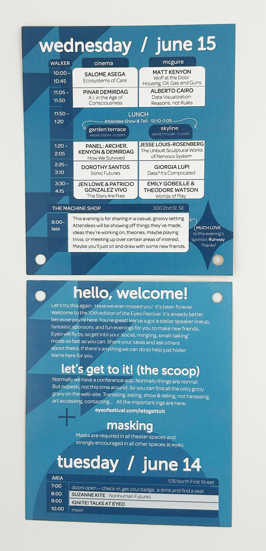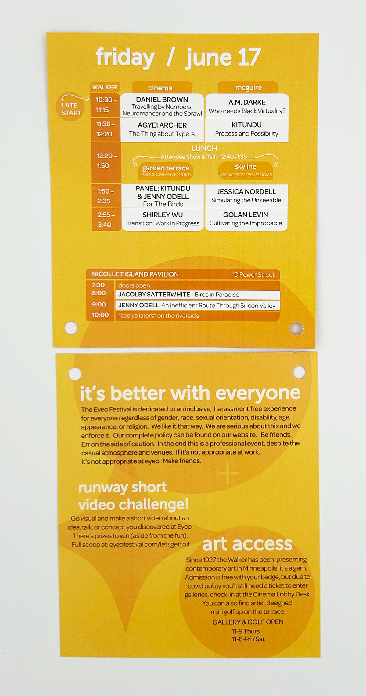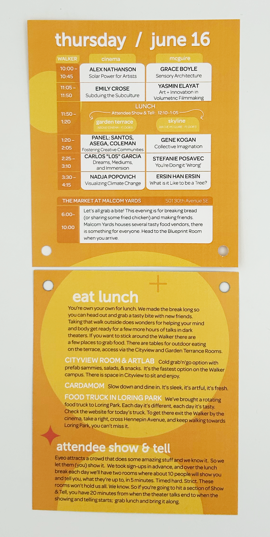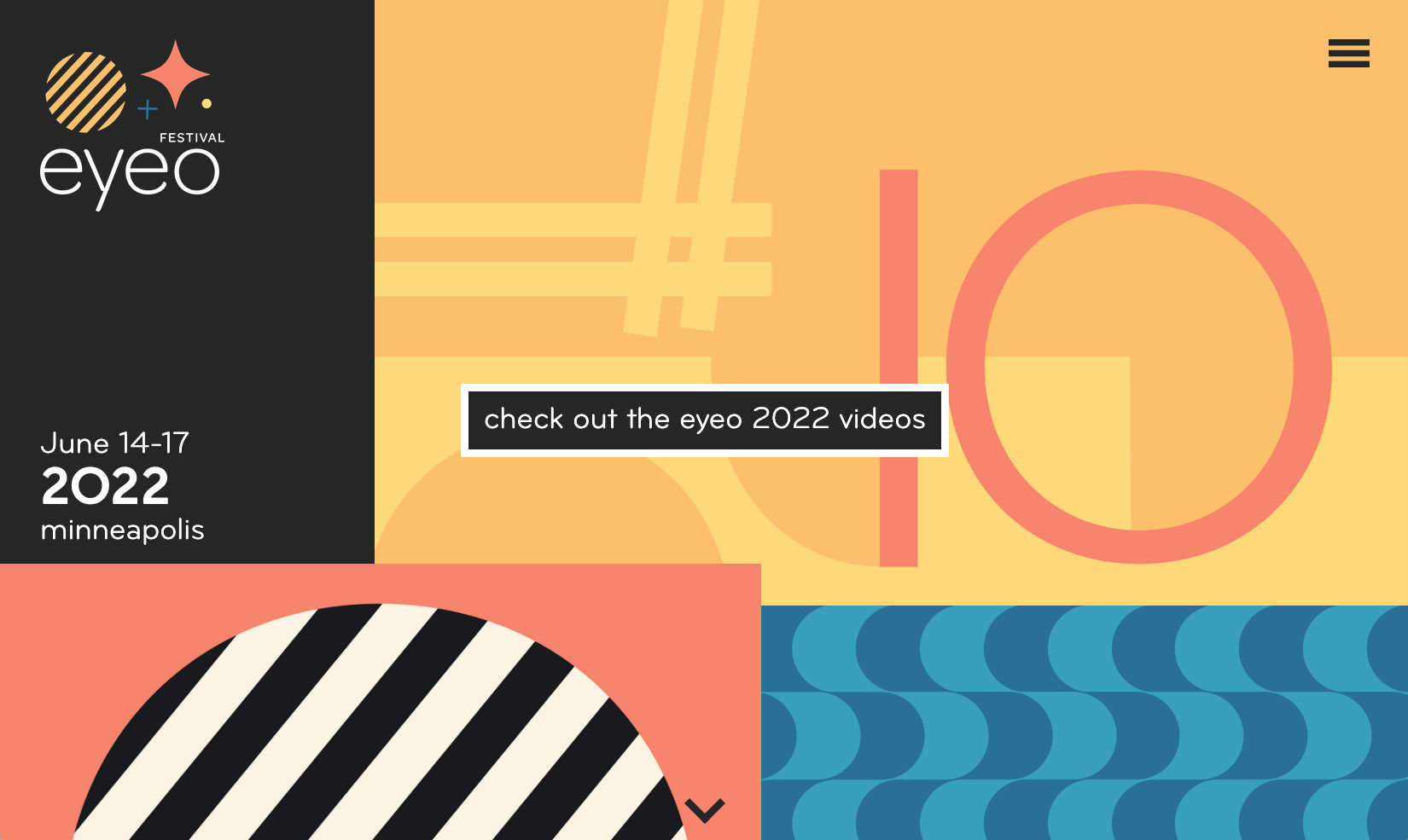 I produced eyeo along with the festival founders (a 3-person team), and was involved in every aspect of the planning. SQUAWK first got involved creating the animated video trailers for the festival. Each year I also designed all assets for the festival including programs, website, name badges, signage, and swag for the event.